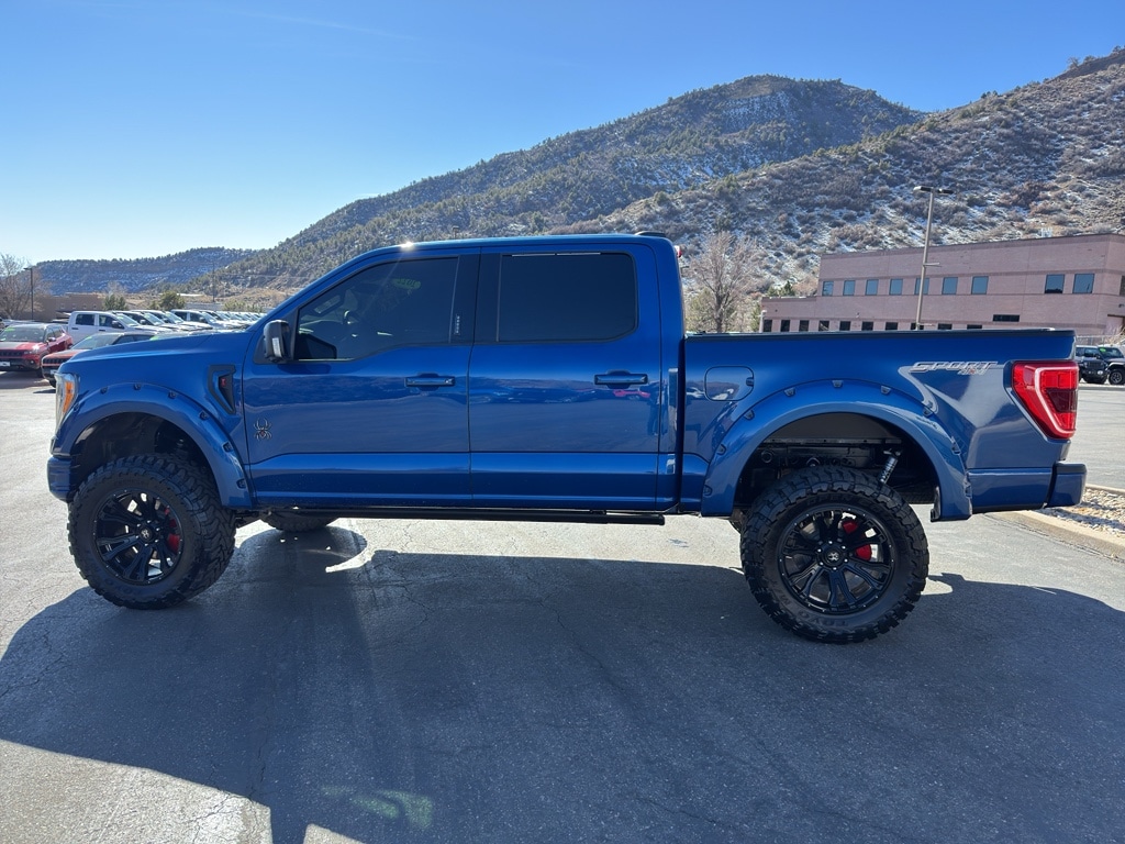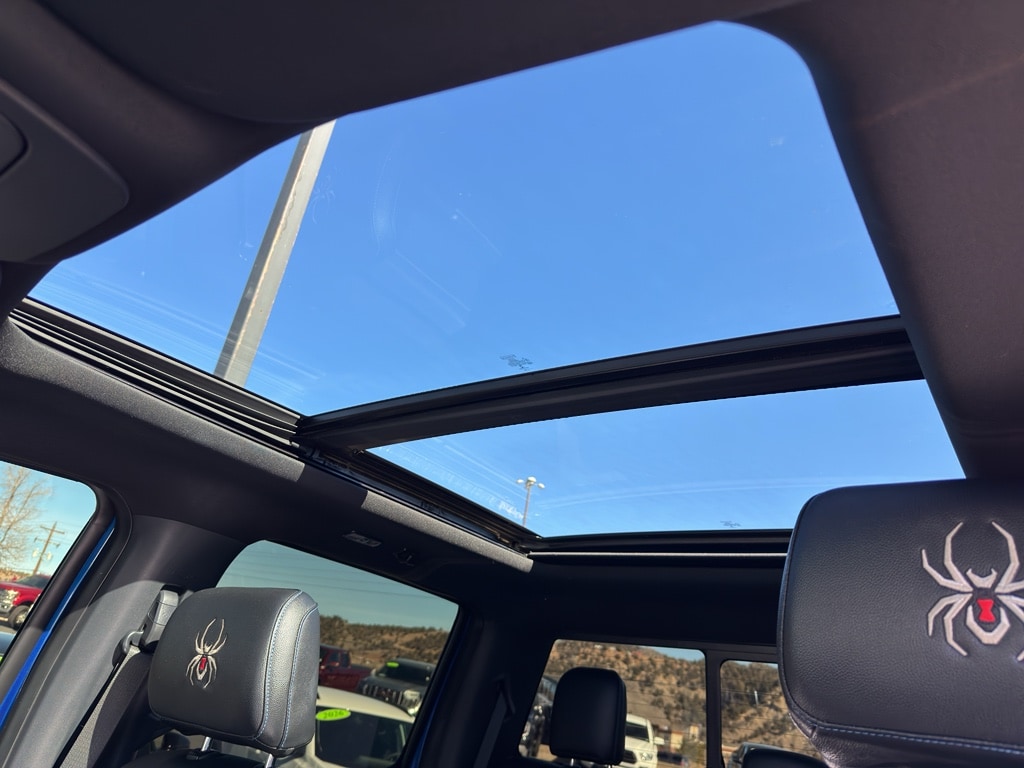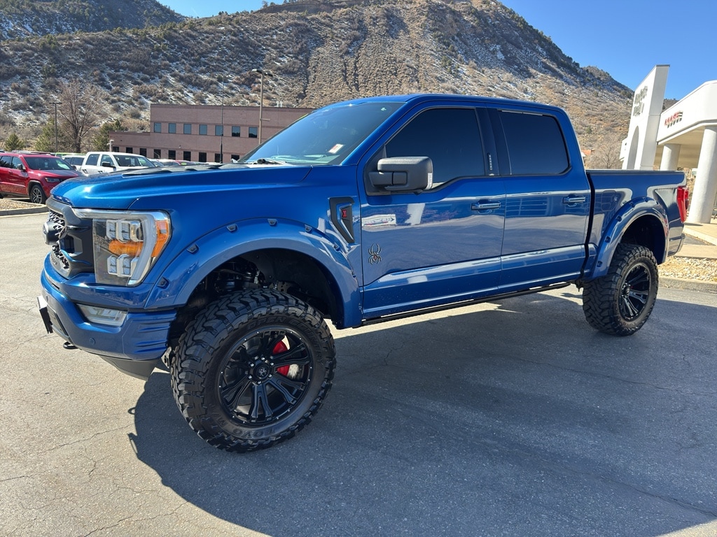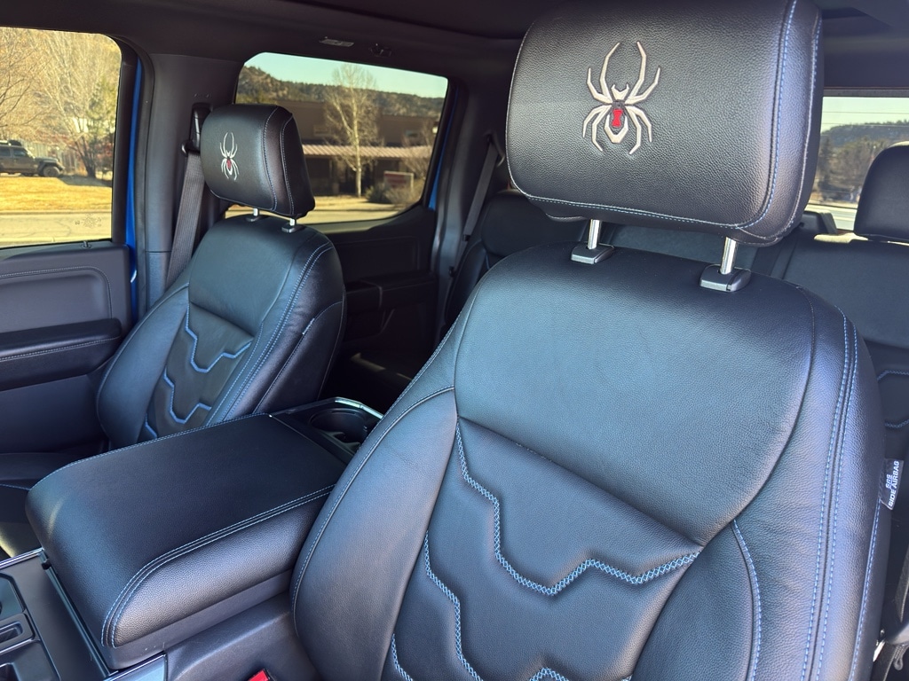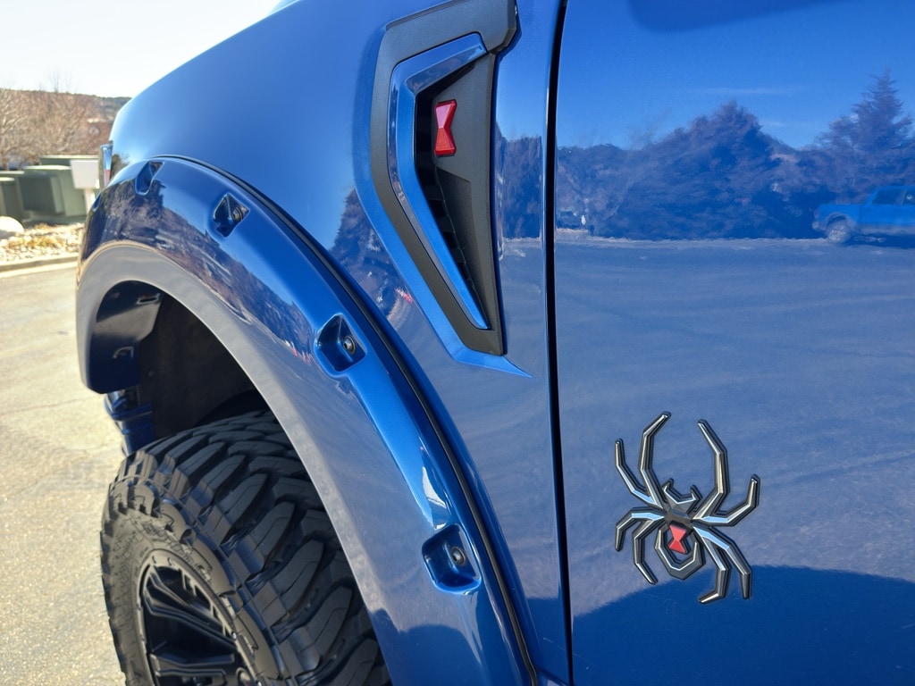 This Ford F150 has a Rocky Mountain Truckworks Black Widow upfit package that includes a 6" suspension lift, 20" Black Widow wheels with painted wheel rings, 35" Toyo M/T tires, Black Widow Caliper Covers, Black Widow exclusive fender flares, dual exhaust with black tips, Black Widow fender vents, Black Widow custom hood vent, Black Widow grill, tinted front windows, Black Widow exterior badging, Black Widow gauge cluster, Black Widow door sills, speedometer calibration, AMP power running boards, painted factory bumpers, premium stitched leather upgrade, meets FMVSS standards. When you encounter slick or muddy roads, you can engage the four wheel drive on this 1/2 ton pickup and drive with confidence. Start this unit from inside with remote start. You'll never again be lost in a crowded city or a country region with the navigation system on this 1/2 ton pickup. Greater towing safety becomes standard with the installed trailer brake.